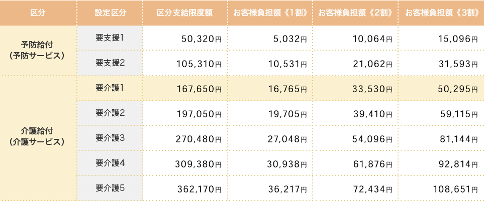 介護保険の支給限度額内なら、お客様の負担額は費用の1割でご利用可能です。 保険給付(支給)の額は、認定区分によって異なります。